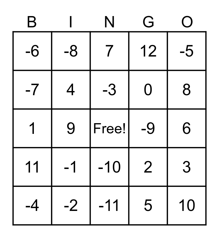 This bingo card has a free space and 24 words: -1, -2, -3, -4, -5, -6, -7, -8, -9, -10, 0, 1, 2, 3, 4, 5, 6, 7, 8, 9, 10, 11, 12 and -11.