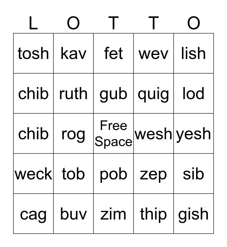 This bingo card has a free space and 24 words: tob, buv, gub, cag, lish, tosh, chib, kav, wesh, pob, quig, chib, zep, sib, ruth, thip, yesh, fet, lod, rog, gish, weck, wev and zim.