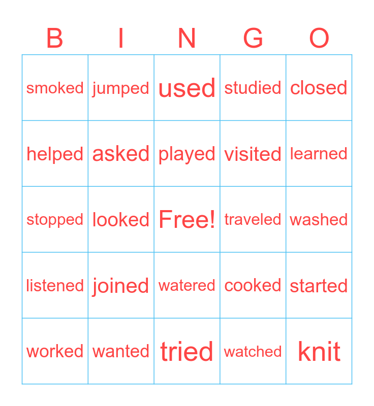 This bingo card has a free space and 30 words: wanted, lived, looked, stayed, smoked, used, asked, watered, traveled, tried, washed, knit, watched, arrived, learned, answered, cooked, listened, joined, closed, stopped, collected, jumped, visited, helped, studied, started, worked, played and walked.