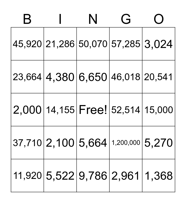 This bingo card has a free space and 24 words: 2,100, 5,522, 6,650, 11,920, 3,024, 45,920, 23,664, 21,286, 52,514, 5,664, 46,018, 2,000, 1,200,000, 5,270, 4,380, 2,961, 15,000, 50,070, 20,541, 14,155, 1,368, 37,710, 57,285 and 9,786.