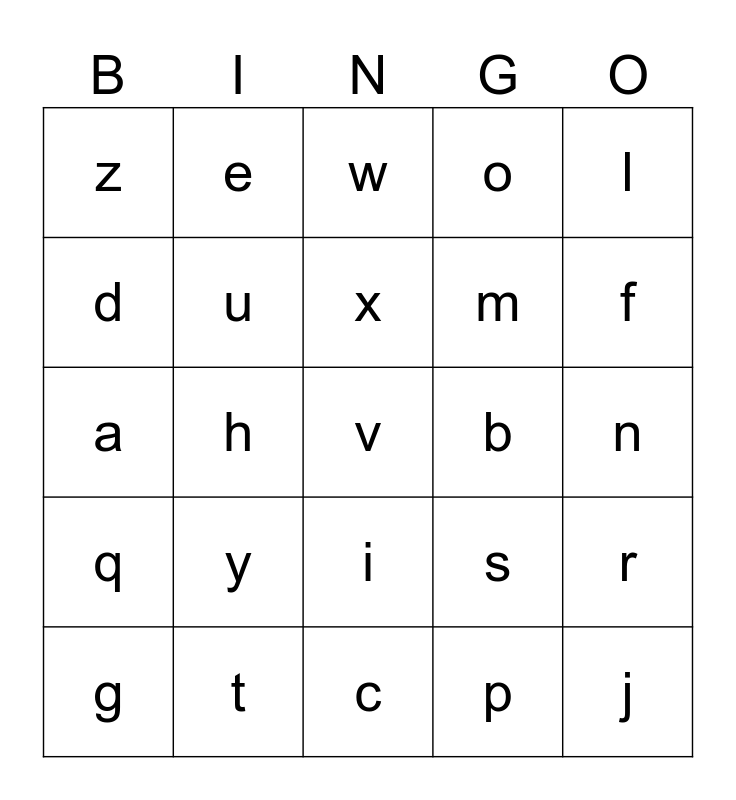 This bingo card has a free space and 24 words: y, t, x, g, l, z, d, e, b, i, m, a, s, r, u, p, n, w, f, h, j, q, o and c.