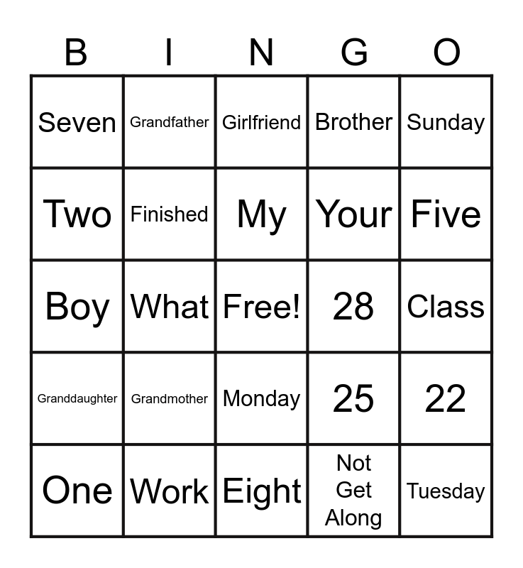 This bingo card has a free space and 98 words: Like, Dislike, Favorite, Class, Learn, 11, Cousin, Friend, School, Today, Sick, Mother, Good, Grandmother, Girl, Grandfather, Boy, Woman, Man, Family, Son, 12, Daughter, Aunt, Six, Seven, Eight, Nine, Sister, Uncle, One, Two, Three, Four, Five, Father, Brother, Ten, What, 13, Sick of, My, Your, 14, Wednesday, Monday, 19, 15, 16, 17, Have, 20, Mine, 18, Wonderful, Grandson, Granddaughter, Niece, Nephew, Husband, Wife, Inlaw, Married, Engaged, Divorced, Separated, Common Law, Single, Dating, Boyfriend, Girlfriend, Get Along, Not Get Along, Sorry, Please, Thank You, Friday, None, 30, Tuesday, Thursday, Finished, Work, Thankful, Boss, 21, Tremendous, Fantastic, 22, 23, 24, 25, 26, 27, 28, 29, Sunday and Where.