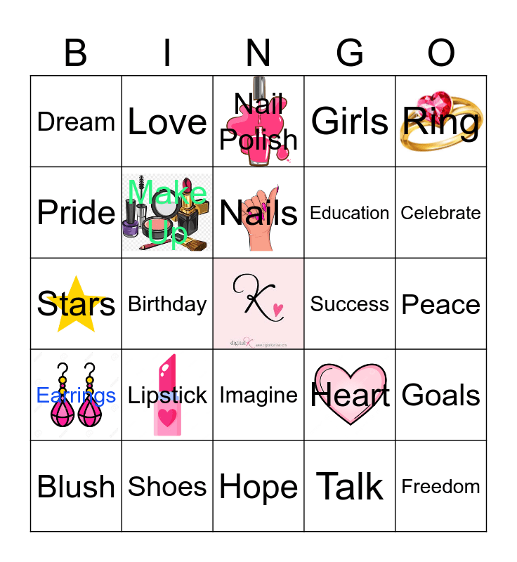 This bingo card has 8 images, a free space and 24 words: Lipstick, Shoes, Nails, Blush, Ring, Dream, Pride, Love, Success, Imagine, Education, Stars, Heart, Goals, Make Up, Talk, Peace, Nail Polish, Celebrate, Birthday, Freedom, Earrings, Girls and Hope.