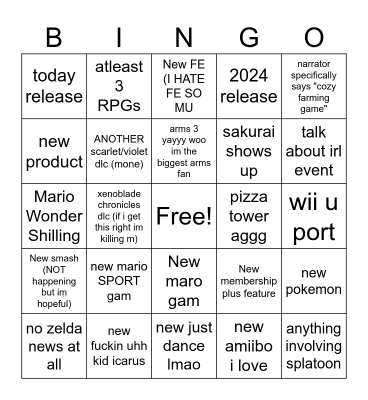 This bingo card has a free space and 24 words: new mario SPORT gam, new fuckin uhh kid icarus, arms 3 yayyy woo im the biggest arms fan, no zelda news at all, narrator specifically says "cozy farming game", today release, new product, atleast 3 RPGs, pizza tower aggg, New maro gam, sakurai shows up, Mario Wonder Shilling, New membership plus feature, new pokemon, ANOTHER scarlet/violet dlc (mone), new amiibo i love, wii u port, New FE (I HATE FE SO MU, talk about irl event, xenoblade chronicles dlc (if i get this right im killing m), anything involving splatoon, New smash (NOT happening but im hopeful), 2024 release and new just dance lmao.