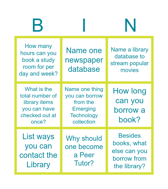 This bingo card has 30 words: Name the Library's chat service, Name the opening hours for the library, Name one of the college's Librarians, Name one of the college's Learning Strategists, How many hours can you book a study room for per day and week?, Name a library database to stream popular movies, List ways you can contact the Library, Which book is featured this month for the World’s Easiest Book Club?, What can a librarian help you with?, Name one academic journal you can access through the library, Name a Page1+ search filter category, Show us your library card (MyCard), Name an online database starting with the letter "W", Name one video featured on the library's YouTube channel, Search a topic using Page1+, Name the Library's chat service, Find one course that you can get a tutor for, Name of the the Learning Centre's Math Strategists, What does LLC stand for?, Name one thing you can borrow from the Emerging Technology collection, What can a Learning Strategist help you with?, Name one academic journal you can access through the library, Name one newspaper database, Besides books, what else can you borrow from the library?, How long can you borrow a book?, What is the total number of library items you can have checked out at once?, How do you request material from another Centennial campus Library?, How do you fully access online library databases off campus?, Why should one become a Peer Tutor? and Other than the circulation desk, what is another way to return books?.