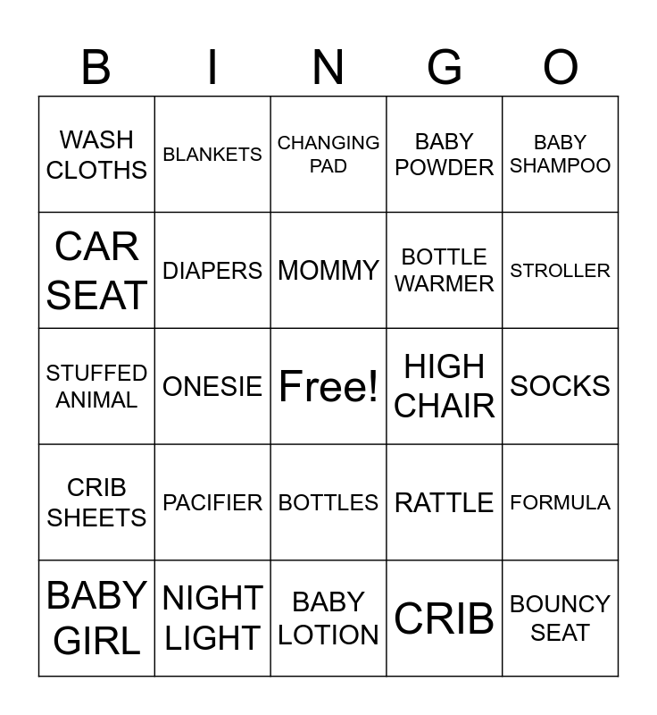 This bingo card has a free space and 30 words: NIGHT LIGHT, BOOK, ONESIE, BIBS, WASH CLOTHS, CHANGING PAD, DIAPERS, BOTTLES, HIGH CHAIR, BABY LOTION, SOCKS, BOUNCY SEAT, CRIB, BATH TOWEL, STROLLER, MONITOR, RATTLE, CRIB SHEETS, PACIFIER, BABY SHAMPOO, STUFFED ANIMAL, DIAPER BAG, BLANKETS, BOTTLE WARMER, CAR SEAT, BABY POWDER, FORMULA, BABY GIRL, MOMMY and DADDY.
