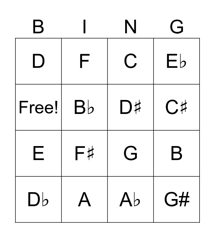 This bingo card has 16 words: A, B, C, D, E, F, G, A♭, Free!, B♭, D♭, E♭, F♯, C♯, D♯ and G#.