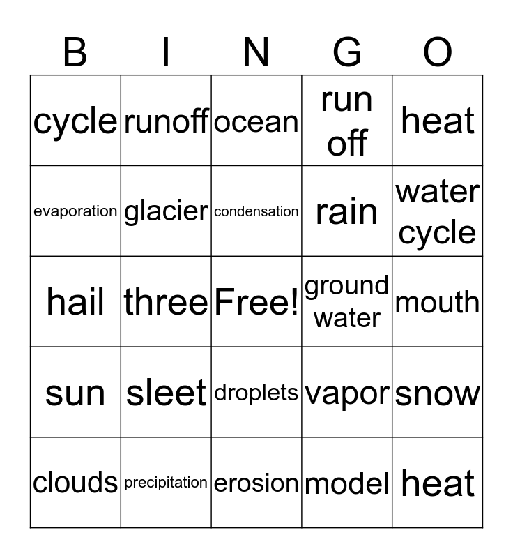 This bingo card has a free space and 24 words: sleet, precipitation, condensation, clouds, heat, cycle, evaporation, runoff, ground water, droplets, rain, hail, vapor, snow, glacier, model, mouth, ocean, water cycle, three, heat, sun, run off and erosion.