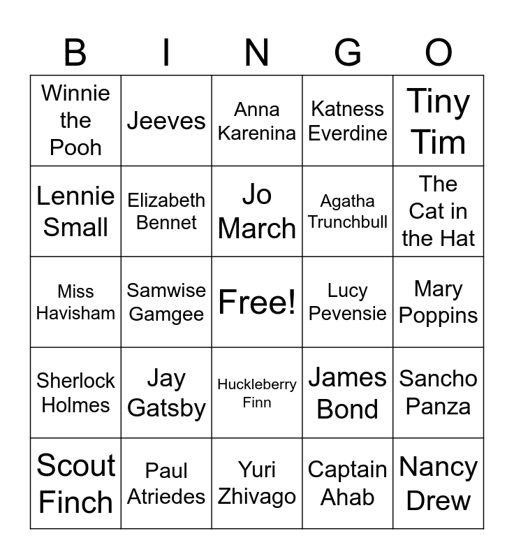 This bingo card has a free space and 39 words: Anne Shirley, Harry Potter, Alex Cross, Elizabeth Bennet, Scout Finch, Huckleberry Finn, Jo March, Holden Caufield, Tiny Tim, Sherlock Holmes, Samwise Gamgee, Katness Everdine, Nancy Drew, Mary Poppins, Lucy Pevensie, Jay Gatsby, Scarlett O'Hara, Winnie the Pooh, Armand Gamache, James Bond, Lennie Small, Yuri Zhivago, Agatha Trunchbull, The Cat in the Hat, Evelyn Hugo, James Herriott, Laura Ingalls, Odysseus, Juliet Capulet, Jeeves, Elizabeth Zott, Natasha Rostova, Anna Karenina, Paul Atriedes, Captain Ahab, Offred, Sancho Panza, Miss Havisham and Jack Ryan.