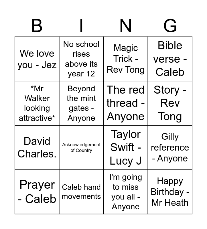 This bingo card has 18 words: Acknowledgement of Country, Happy Birthday - Mr Heath, Magic Trick - Rev Tong, We love you - Jez, Taylor Swift - Lucy J, Bible verse - Caleb, Prayer - Caleb, No school rises above its year 12, Story - Rev Tong, David Charles., I'm going to miss you all - Anyone, *Mr Walker looking attractive*, Gilly reference - Anyone, Beyond the mint gates - Anyone, The red thread - Anyone, Jeremy going bright red, Caleb hand movements and T-Dog Magic trick - T-Dog.