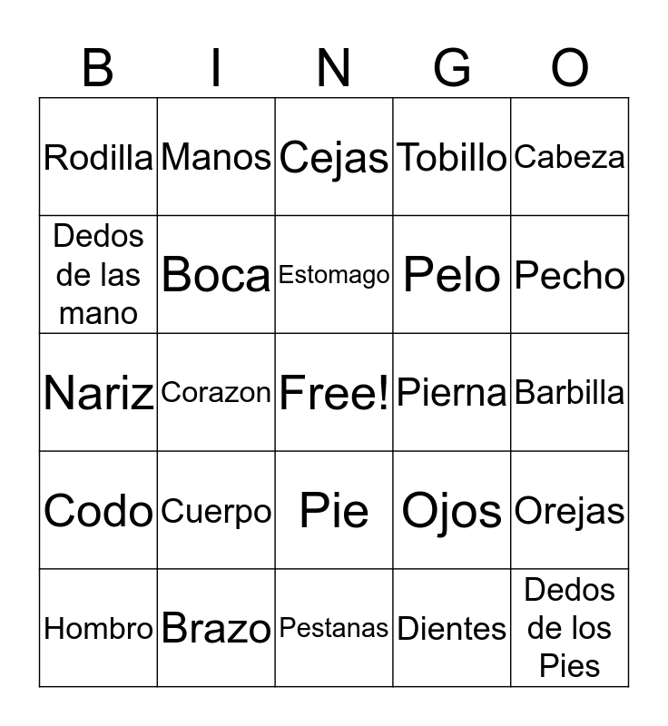 This bingo card has a free space and 24 words: Cuerpo, Brazo, Estomago, Hombro, Cabeza, Rodilla, Dedos de las mano, Manos, Pierna, Pie, Pelo, Nariz, Ojos, Orejas, Boca, Dientes, Barbilla, Cejas, Pecho, Corazon, Dedos de los Pies, Codo, Tobillo and Pestanas.