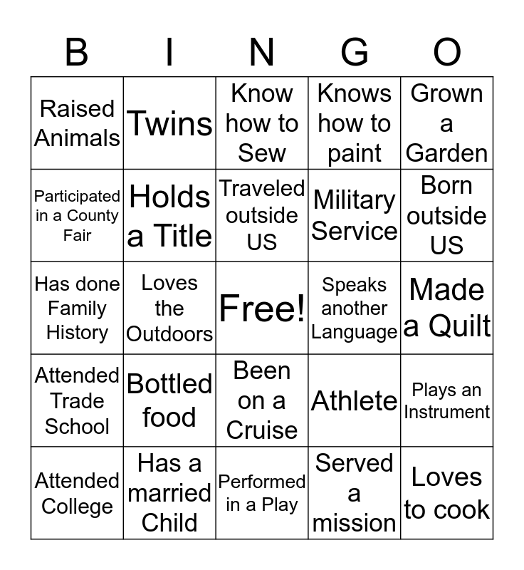 This bingo card has a free space and 24 words: Bottled food, Has a married Child, Traveled outside US, Attended College, Grown a Garden, Raised Animals, Participated in a County Fair, Twins, Speaks another Language, Been on a Cruise, Military Service, Has done Family History, Athlete, Plays an Instrument, Holds a Title, Served a mission, Made a Quilt, Know how to Sew, Born outside US, Loves the Outdoors, Loves to cook, Attended Trade School, Knows how to paint and Performed in a Play.