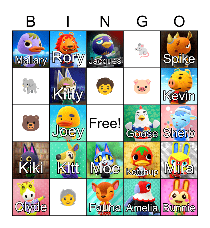 This bingo card has 24 images, a free space and 31 words: Fauna, Deli, Joey, Samson, Mallary, Jacques, Kitty, Ketchup, Goose, Amelia, Sherb, Bunnie, Lucy, Ed, Kevin, Aurora, Mira, Kitt, Kiki, Moe, Spike, Gwen, Clyde, Rory, 🐷, 🐘, 🐁, 🐻, 🧓, 🧒 and 🎂.