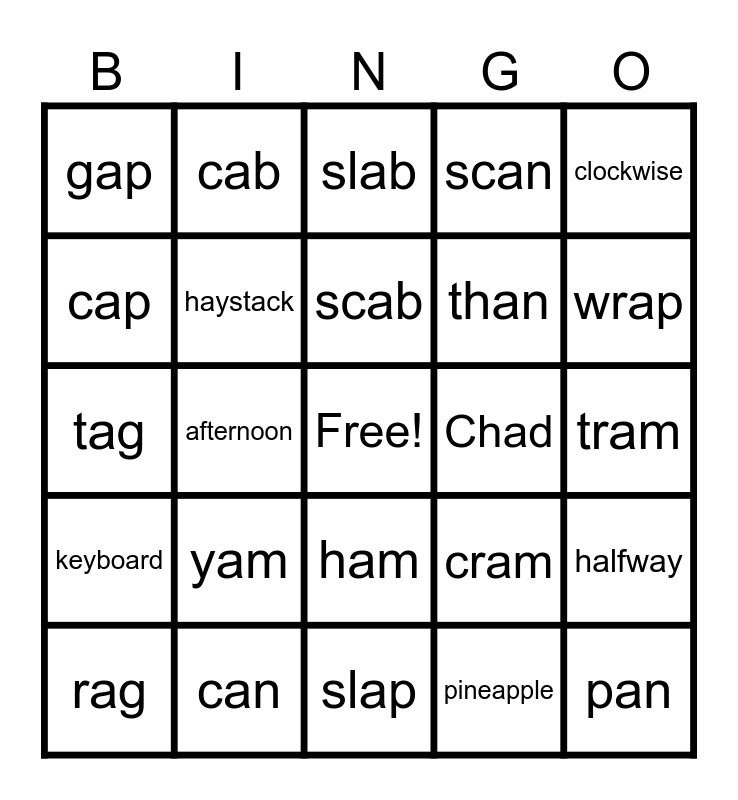 This bingo card has a free space and 32 words: pineapple, basketball, afternoon, ladybug, keyboard, haystack, clockwise, halfway, cab, dab, scab, slab, bad, had, Chad, glad, rag, tag, ham, yam, cram, swam, tram, can, pan, scan, than, cap, gap, slap, trap and wrap.