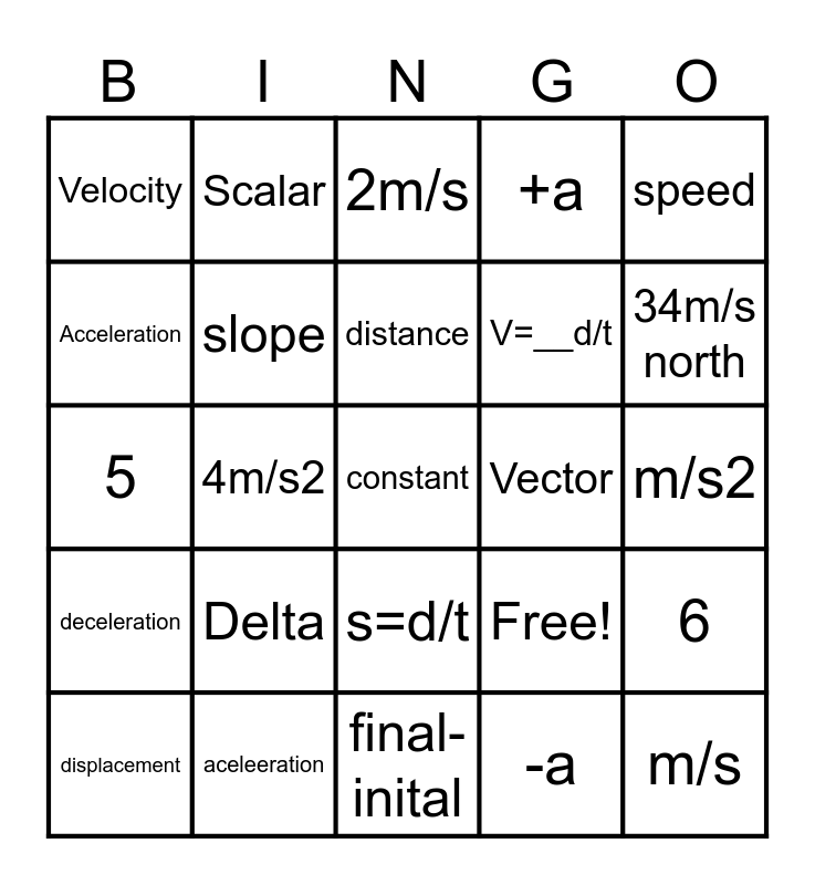 This bingo card has 25 words: Delta, final-inital, distance, displacement, speed, Velocity, Acceleration, Scalar, Vector, s=d/t, V=__d/t, 5, Free!, 6, slope, m/s, m/s2, 2m/s, 34m/s north, 4m/s2, constant, aceleeration, deceleration, +a and -a.