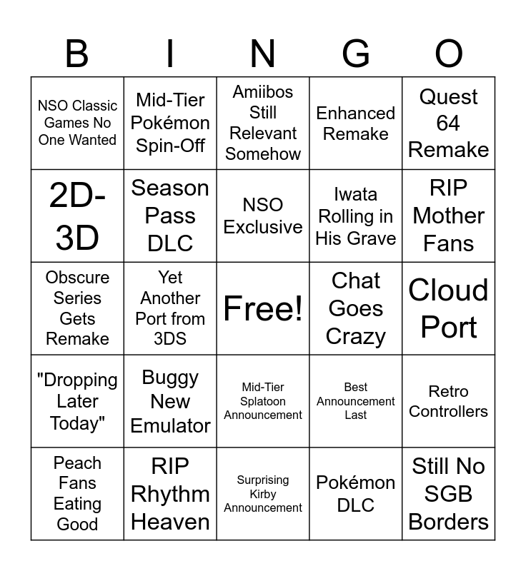 This bingo card has a free space and 37 words: Devs Can, Just Won't, New Soup, Unique Mario, Season Pass DLC, Retro Controllers, Buggy New Emulator, NSO Exclusive, [Game Series] 99, Quest 64 Remake, Bad Remake, Yet Another Port from 3DS, Enhanced Remake, Still No SGB Borders, Cloud Port, 2D-3D, "Dropping Later Today", Zelda DLC, Amiibos Still Relevant Somehow, Mid-Tier Splatoon Announcement, Chat Goes Crazy, NSO Classic Games No One Wanted, RIP Mother Fans, Peach Fans Eating Good, Surprising Kirby Announcement, Beloved Franchise Gets Spin-Off, Pokémon DLC, Mid-Tier Pokémon Spin-Off, Too Many 3rd Party Games, WTF was That, Switch Lite Incompatible, No Switch Lite OLED, RIP Rhythm Heaven, Obscure Series Gets Remake, Nintendo Direct Recap, Best Announcement Last, Iwata Rolling in His Grave and Sequel No One Wanted.