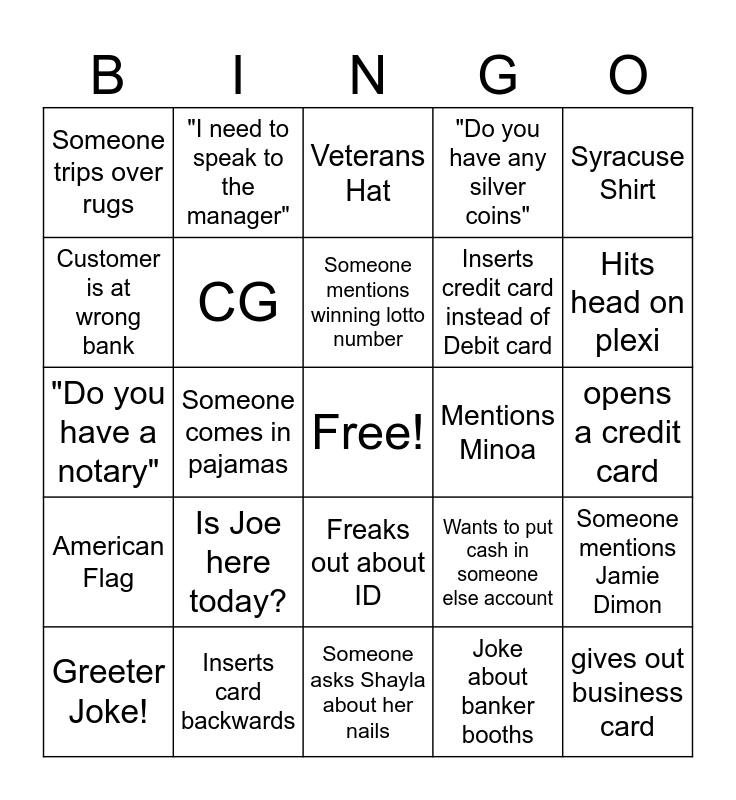 This bingo card has a free space and 29 words: Greeter Joke!, Someone drops off goodies, Someone comes in pajamas, "are you giving out free samples", Someone trips over rugs, Veterans Hat, CG, Is Joe here today?, Mentions Minoa, Inserts card backwards, opens a credit card, gives out business card, Someone asks Shayla about her nails, Joke about banker booths, Hits head on plexi, asks about Chase apparel, Freaks out about ID, American Flag, Syracuse Shirt, "Do you have a notary", Wants to put cash in someone else account, "I need to send a wire", Inserts credit card instead of Debit card, Customer is at wrong bank, "Do you have any silver coins", "I need to speak to the manager", Someone mentions Jamie Dimon, Someone mentions winning lotto number and asks for statement to be printed.