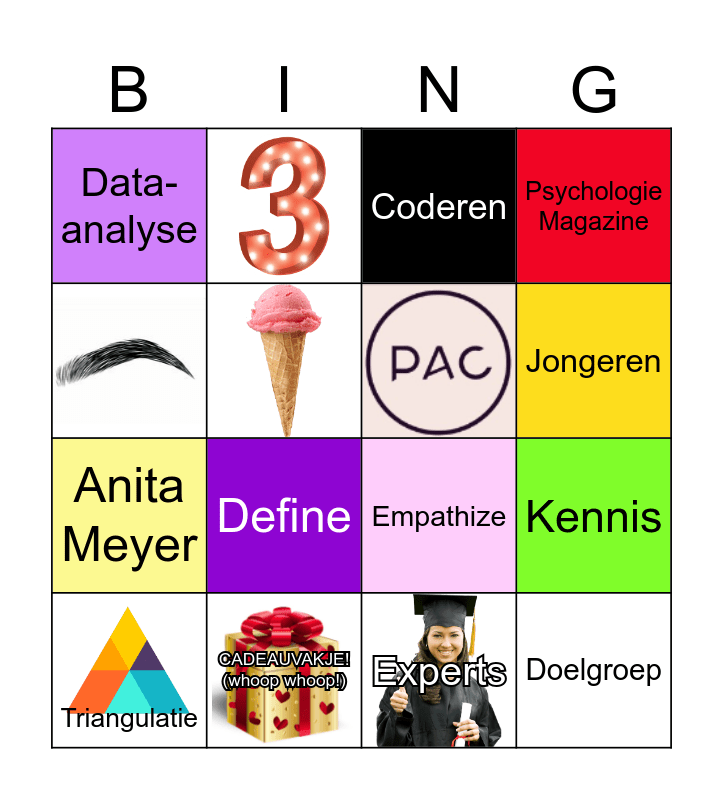 This bingo card has 12 images and 20 words: Causaliteit, Kwalitatieve interviews, Anita Meyer, Doorvragen, Coderen, Doelgroep, CADEAUVAKJE! (whoop whoop!), Empathize, Psychologie Magazine, Kaders, Eva, Define, Enquête, Jongeren, Platform, Data-analyse, Triangulatie, Kennis, Experts and 70 plussers.
