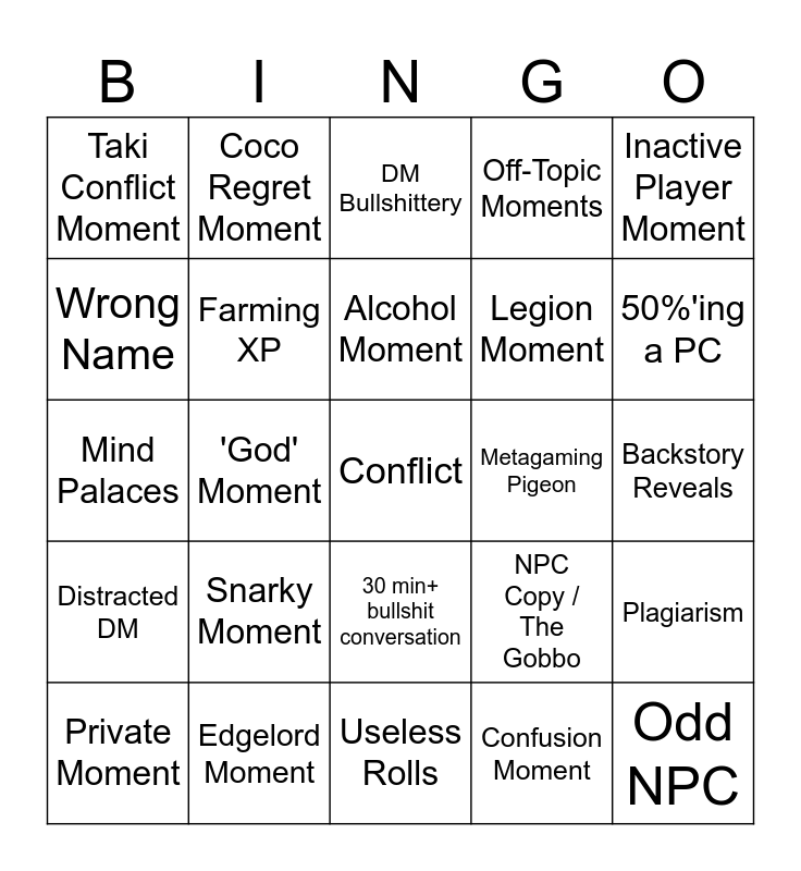 This bingo card has a free space and 24 words: Snarky Moment, Edgelord Moment, Alcohol Moment, Private Moment, Inactive Player Moment, Taki Conflict Moment, Wrong Name, Coco Regret Moment, Metagaming Pigeon, 30 min+ bullshit conversation, Legion Moment, Mind Palaces, NPC Copy / The Gobbo, Plagiarism, Farming XP, Confusion Moment, Backstory Reveals, DM Bullshittery, 50%'ing a PC, 'God' Moment, Odd NPC, Distracted DM, Off-Topic Moments and Useless Rolls.
