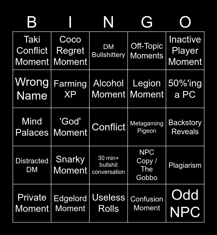 This bingo card has a free space and 24 words: Snarky Moment, Edgelord Moment, Alcohol Moment, Private Moment, Inactive Player Moment, Taki Conflict Moment, Wrong Name, Coco Regret Moment, Metagaming Pigeon, 30 min+ bullshit conversation, Legion Moment, Mind Palaces, NPC Copy / The Gobbo, Plagiarism, Farming XP, Confusion Moment, Backstory Reveals, DM Bullshittery, 50%'ing a PC, 'God' Moment, Odd NPC, Distracted DM, Off-Topic Moments and Useless Rolls.