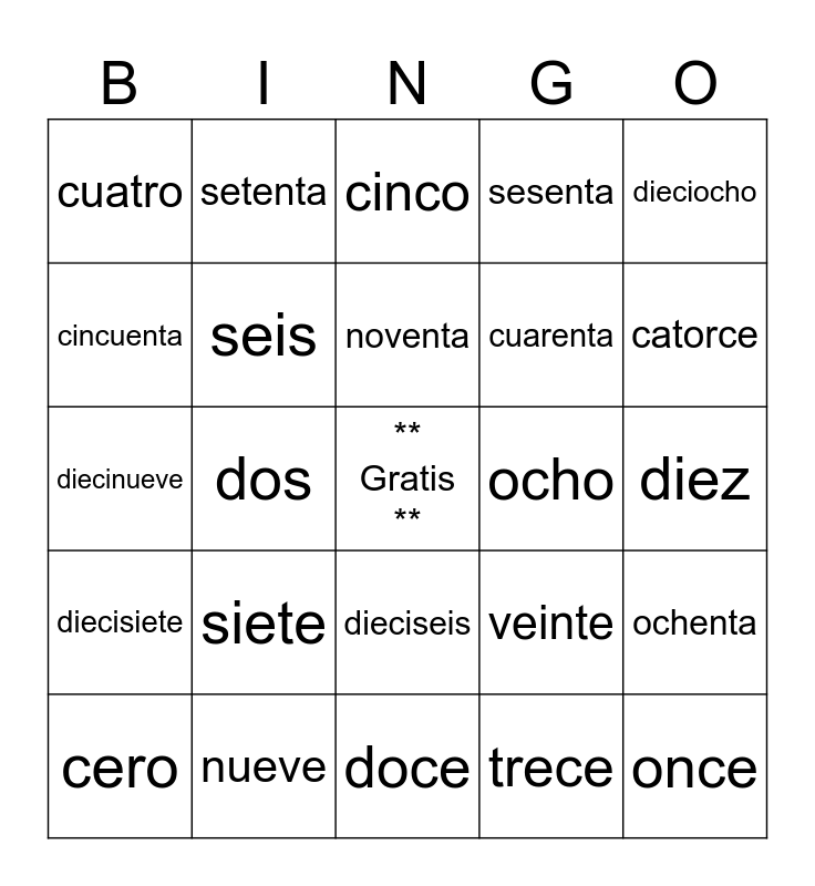 This bingo card has a free space and 29 words: cero, uno, dos, tres, cuatro, cinco, seis, siete, ocho, nueve, diez, once, doce, trece, catorce, quince, dieciseis, diecisiete, dieciocho, diecinueve, veinte, treinta, cuarenta, cincuenta, sesenta, setenta, ochenta, noventa and cien.