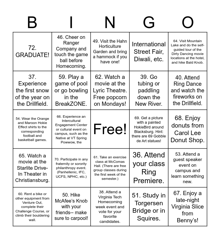 This bingo card has a free space and 39 words: 56. Take a class that seems interesting, even if it has nothing to do with your major!, 57. Ride on Blacksburg Transit’s Ring Bus., 58. Visit the Virginia Tech Football Museum at the Merryman Athletic Facility., 59. Play a game of pool or go bowling in the BreakZONE., 60. Rent a bike or other equipment from Venture Out, complete their Challenge Course, or climb their bouldering wall., 61. Take an exercise class at McComas Hall. (There are free group classes during the first week of the semester.), 62. Watch a movie at the Lyric Theatre. Free popcorn on Mondays!, 63. Visit Perspectives Gallery in Squires to view the newest art exhibit., 64. Visit Mountain Lake and do the self-guided tour of the Dirty Dancing movie locations at the hotel, and hike Bald Knob., 65. Watch a movie at the Starlite Drive-In Theater in Christiansburg., 66. Experience an Intercultural Engagement Center or cultural event on campus, such as the Native at VT Spring Powwow, the, International Street Fair, Diwali, etc., 67. Enjoy a late-night Virginia Slice from Benny’s!, 68. Enjoy donuts from Carol Lee Donut Shop., 69. Get a picture with a painted HokieBird around Blacksburg. Hint: there are 69 Gobble de Art statues!, 70. Participate in any fraternity or sorority philanthropy event. (Panhellenic, IFC, UCFS, NPHC, etc.), 71. Attend a play put on by the School of Performing Arts and Cinema or attend a performance at the Moss Arts Center., 72. GRADUATE!, 35. Eat a turkey leg at a home football game., 36. Attend your class Ring Premiere., 37. Experience the first snow of the year on the Drillfield., 38. Attend a Virginia Tech Homecoming week event and vote for your favorite candidates., 39. Go tubing or paddling down the New River., 40. Attend Ring Dance and watch the fireworks on the Drillfield., 41. Grab a late-night snack at DX or a Milkshake from Deets., 42. Go to a holiday dinner at D2., 43. Eat Sunday brunch at West End or D2., 44. Support Downtown Blacksburg and eat at places like PK’s, The Cellar, Cabo Fish Taco, Souvlaki, Gillie’s, Joe’s Diner, or Green’s Grill and Sushi Bar., 45. Participate in the 3.2 for 32 Remembrance Run in April., 46. Cheer on Ranger Company and touch the game ball before Homecoming., 47. Attend a Downtown Blacksburg sponsored event, such as the Farmer’s Market, Steppin’ Out, or the Holiday Parade., 48. Get a parking ticket from Virginia Tech Parking Services. (Let’s face it: it’s inevitable.), 49. Visit the Hahn Horticulture Garden and bring a hammock if you have one!, 50. Hike McAfee’s Knob with your friends-- make sure to carpool!, 51. Study in Torgersen Bridge or in Squires., 52. Gather a team together and participate in the VT Hunt---one of the largest student-run scavenger hunts in the U.S.!, 53. Attend a guest speaker event on campus and learn something new., 54. Wear the Orange and Maroon Hokie Effect shirts to the corresponding football and basketball games. and 55. Explore the area’s local parks, such as the Huckleberry Trail, Heritage Park, Pandapas Pond, Deerfield Trail, or Claytor Lake..
