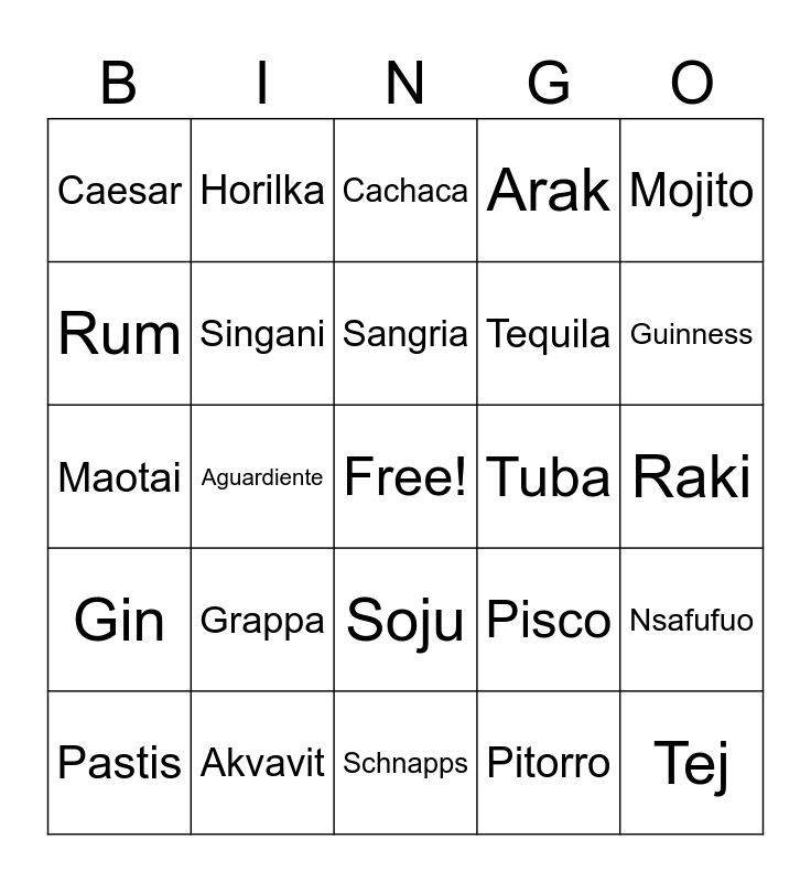 This bingo card has a free space and 24 words: Grappa, Akvavit, Sangria, Pastis, Mojito, Caesar, Rum, Horilka, Tuba, Soju, Tequila, Maotai, Pisco, Nsafufuo, Singani, Pitorro, Raki, Cachaca, Guinness, Aguardiente, Tej, Gin, Arak and Schnapps.