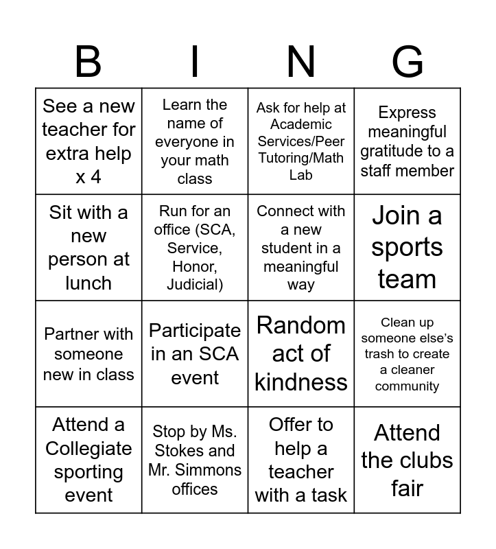 This bingo card has 23 words: Attend the clubs fair, Attend a club meeting, Join a sports team, Participate in the fall play (acting/tech/pit orchestra), Sit with a new person at lunch, See a new teacher for extra help x 4, Run for an office (SCA, Service, Honor, Judicial), Learn the name of everyone in your math class, Attend a Collegiate sporting event, Attend the fall play, Participate in an SCA event, Partner with someone new in class, Volunteer at a non-school activity, Introduce yourself to Mr. Peebles, Stop by Ms. Stokes and Mr. Simmons offices, Introduce yourself to Mr. Loach or Mr. Palyo, Ask for help at Academic Services/Peer Tutoring/Math Lab, Random act of kindness, Connect with a new student in a meaningful way, Clean up someone else’s trash to create a cleaner community, Express meaningful gratitude to a staff member, Offer to help a teacher with a task and Start a study group with members of a class.