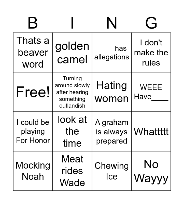 This bingo card has 16 words: Meat rides Wade, Whattttt, ____ has allegations, Thats a beaver word, I could be playing For Honor, golden camel, A graham is always prepared, Chewing Ice, Free!, Turning around slowly after hearing something outlandish, Mocking Noah, I don't make the rules, look at the time, WEEE Have____, Hating women and No Wayyy.