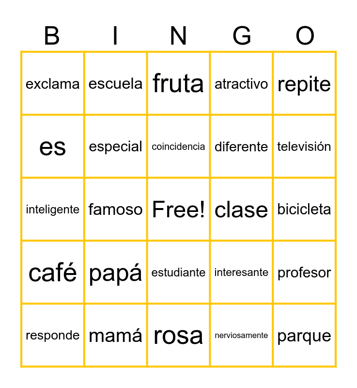 This bingo card has a free space and 24 words: papá, mamá, coincidencia, responde, repite, exclama, es, escuela, clase, estudiante, diferente, inteligente, interesante, profesor, especial, nerviosamente, bicicleta, fruta, televisión, famoso, parque, café, atractivo and rosa.