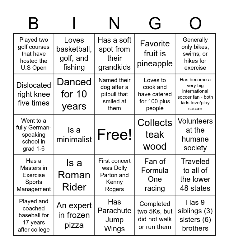 This bingo card has a free space and 48 words: Has 3 little girls all under the age of 4, Has 9 siblings (3) sisters (6) brothers, Was an art major for 2 years and specialized in candle carving, Has Parachute Jump Wings, Is a Roman Rider, Played 10 days-14 rounds of golf in the rain-and loved it, Loves basketball, golf, and fishing, Enjoys the outdoors (hunting, archery, camping, skiing, golf), Dislocated right knee five times, Broke their arm twice, Danced for 10 years, Favorite fruit is pineapple, Traveled to all of the lower 48 states, Fan of Formula One racing, Collects classic cars, Can draw photo realism, Named their dog after a pitbull that smiled at them, Collects teak wood, Had hair to their shoulders in high school, Generally only bikes, swims, or hikes for exercise, Is a minimalist, Completed two 5Ks, but did not walk or run them, Played two golf courses that have hosted the U.S Open, Loves to cook and have catered for 100 plus people, Loves to cook all things, especially smoke meat, Has become a very big international soccer fan - both kids love/play soccer, Played and coached baseball for 17 years after college, Loves Dwight Yoakum, First concert was Dolly Parton and Kenny Rogers, Has a Masters in Exercise Sports Management, Loves liver and onions, Owned a hunter/jumper horse farm with 90 horses, Despises running, A new grandfather, An expert in frozen pizza, Enjoys golf and wine, separately, Just went on their first mission trip to the Dominican Republic Eat, sleep, and play pickleball, Volunteers at the humane society, Offered a recording contract at 6 years old, Loves golf even though they almost got my eye taken out with a golf ball, Got lost in a park at 4-years-old and had to be fed through police car window, Really like Yorkies, and now Dachshunds, Has a soft spot from their grandkids, Has a skill set to rebuild old muscle cars, Went to a fully German-speaking school in grad 1-6, Loves grilling on the weekends on the Blackstone, Lived on a strawberry farm and had a horse named Carmel and Started fishing at the age of 12, yet has never harvested a fish.