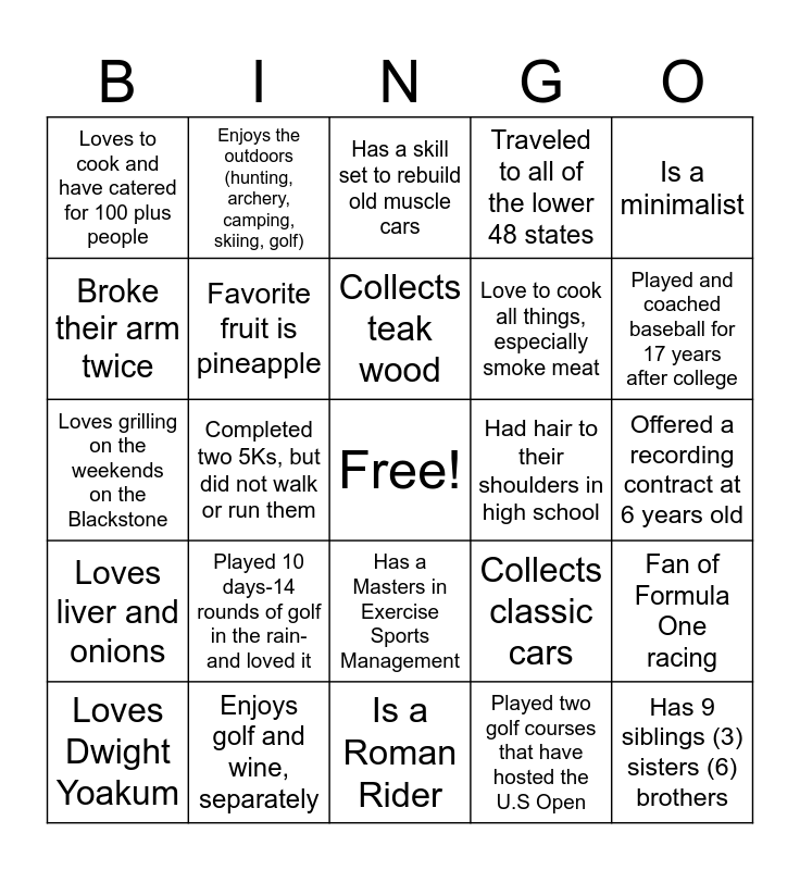 This bingo card has a free space and 48 words: Has 3 little girls all under the age of 4, Has 9 siblings (3) sisters (6) brothers, Was an art major for 2 years and specialized in candle carving I Has Parachute Jump Wings, Is a Roman Rider, Played 10 days-14 rounds of golf in the rain-and loved it, Loves basketball, golf, and fishing, Enjoys the outdoors (hunting, archery, camping, skiing, golf), Dislocated right knee five times, Broke their arm twice, Danced for 10 years, Favorite fruit is pineapple, Traveled to all of the lower 48 states, Fan of Formula One racing, Collects classic cars, Can draw photo realism, Named their dog after a pitbull that smiled at them, Collects teak wood, Had hair to their shoulders in high school, Generally only bikes, swims, or hikes for exercise, Is a minimalist, Completed two 5Ks, but did not walk or run them, Played two golf courses that have hosted the U.S Open, Loves to cook and have catered for 100 plus people, Love to cook all things, especially smoke meat, Has become a very big international soccer fan - both kids love/play soccer, Played and coached baseball for 17 years after college, Loves Dwight Yoakum, First concert was Dolly Parton and Kenny Rogers, Has a Masters in Exercise Sports Management, Loves liver and onions, Owned a hunter/jumper horse farm with 90 horses, Despises running, A new grandfather, An expert in frozen pizza, Enjoys golf and wine, separately, Just went on their first mission trip to the Dominican Republic, Volunteers at the humane society, Offered a recording contract at 6 years old, Loves golf even though they almost got my eye taken out with a golf ball, Got lost in a park at 4-years-old and had to be fed through police car window, Really like Yorkies, and now Dachshunds, Has a soft spot from their grandkids, Has a skill set to rebuild old muscle cars, Went to a fully German-speaking school in grad 1-6, Loves grilling on the weekends on the Blackstone, Lived on a strawberry farm and had a horse named Carmel, Started fishing at the age of 12, yet has never harvested a fish and Eat, sleep, and play pickleball.