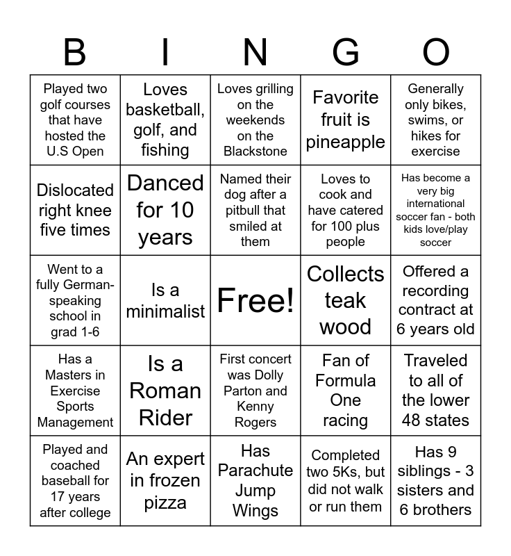 This bingo card has a free space and 49 words: Has 3 little girls all under the age of 4, Has 9 siblings - 3 sisters and 6 brothers, Was an art major for 2 years and specialized in candle carving, Has Parachute Jump Wings, Is a Roman Rider, Played 10 days-14 rounds of golf in the rain-and loved it, Loves basketball, golf, and fishing, Enjoys the outdoors (hunting, archery, camping, skiing, golf), Dislocated right knee five times, Broke their arm twice, Danced for 10 years, Favorite fruit is pineapple, Traveled to all of the lower 48 states, Fan of Formula One racing, Collects classic cars, Can draw photo realism, Named their dog after a pitbull that smiled at them, Collects teak wood, Had hair to their shoulders in high school, Generally only bikes, swims, or hikes for exercise, Is a minimalist, Completed two 5Ks, but did not walk or run them, Played two golf courses that have hosted the U.S Open, Loves to cook and have catered for 100 plus people, Love to cook all things, especially smoke meat, Has become a very big international soccer fan - both kids love/play soccer, Played and coached baseball for 17 years after college, Loves Dwight Yoakum, First concert was Dolly Parton and Kenny Rogers, Has a Masters in Exercise Sports Management, Loves liver and onions, Owned a hunter/jumper horse farm with 90 horses, Despises running, A new grandfather, An expert in frozen pizza, Enjoys golf and wine, separately, Just went on their first mission trip to the Dominican Republic, Volunteers at the humane society, Offered a recording contract at 6 years old, Loves golf even though they almost got my eye taken out with a golf ball, Got lost in a park at 4-years-old and had to be fed through police car window, Really like Yorkies, and now Dachshunds, Has a soft spot from their grandkids, Has a skill set to rebuild old muscle cars, Went to a fully German-speaking school in grad 1-6, Loves grilling on the weekends on the Blackstone, Lived on a strawberry farm and had a horse named Carmel, Started fishing at the age of 12, yet has never harvested a fish and Eat, sleep, and play pickleball.