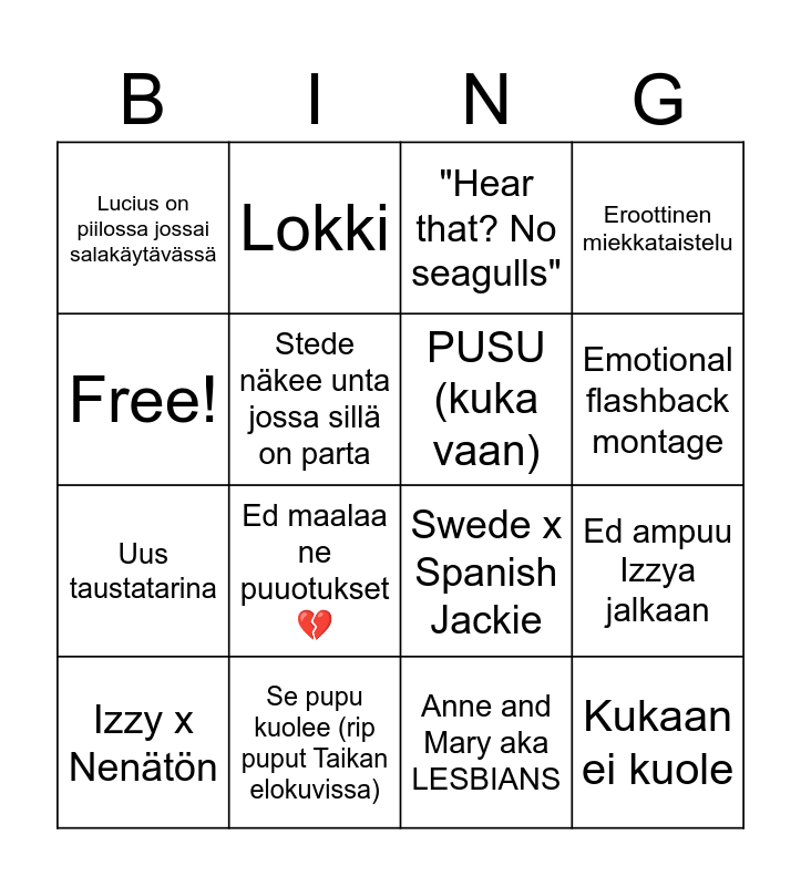 This bingo card has 16 words: Se pupu kuolee (rip puput Taikan elokuvissa), Ed ampuu Izzya jalkaan, "Hear that? No seagulls", Lucius on piilossa jossai salakäytävässä, Uus taustatarina, Lokki, Swede x Spanish Jackie, Anne and Mary aka LESBIANS, Free!, Stede näkee unta jossa sillä on parta, Izzy x Nenätön, Eroottinen miekkataistelu, Ed maalaa ne puuotukset💔, Emotional flashback montage, PUSU (kuka vaan) and Kukaan ei kuole.