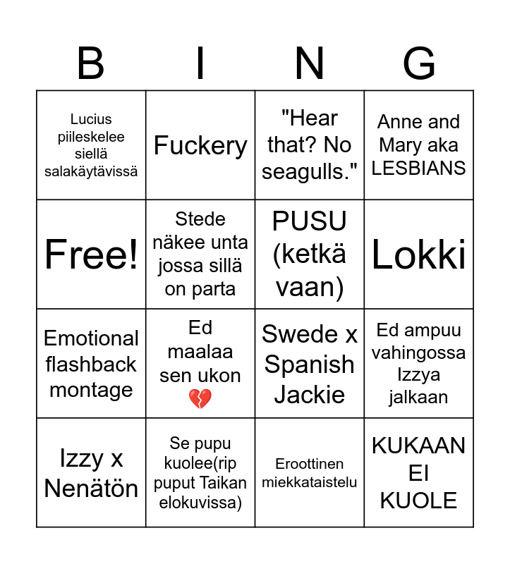 This bingo card has 16 words: Se pupu kuolee(rip puput Taikan elokuvissa), Ed ampuu vahingossa Izzya jalkaan, "Hear that? No seagulls.", Lucius piileskelee siellä salakäytävissä, Emotional flashback montage, Fuckery, Swede x Spanish Jackie, Eroottinen miekkataistelu, Free!, Stede näkee unta jossa sillä on parta, Izzy x Nenätön, Anne and Mary aka LESBIANS, Ed maalaa sen ukon💔, Lokki, PUSU (ketkä vaan) and KUKAAN EI KUOLE.