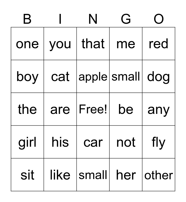 This bingo card has a free space and 24 words: his, like, apple, sit, red, one, boy, you, be, car, small, the, not, fly, cat, her, any, that, dog, are, other, girl, me and small.