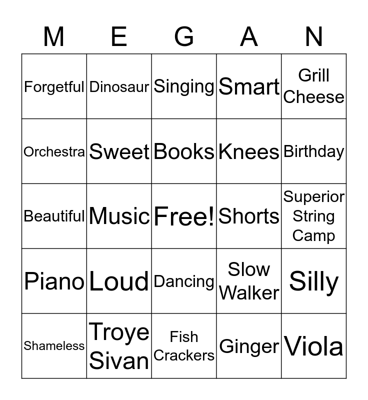 This bingo card has a free space and 24 words: Loud, Troye Sivan, Books, Shameless, Grill Cheese, Forgetful, Orchestra, Dinosaur, Shorts, Dancing, Knees, Beautiful, Slow Walker, Silly, Sweet, Ginger, Superior String Camp, Singing, Birthday, Music, Viola, Piano, Smart and Fish Crackers.
