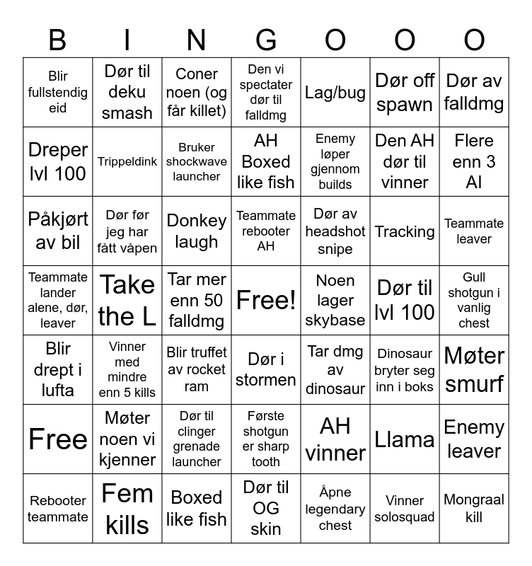This bingo card has a free space and 48 words: AH vinner, Den AH dør til vinner, Dør til OG skin, Take the L, Donkey laugh, Gull shotgun i vanlig chest, Dør til deku smash, Fem kills, Dør off spawn, Dør i stormen, Dør av falldmg, Den vi spectater dør til falldmg, Tracking, Dør av headshot snipe, Free, Dør til lvl 100, Dreper lvl 100, Flere enn 3 AI, Llama, Lag/bug, Enemy løper gjennom builds, Tar mer enn 50 falldmg, Blir fullstendig eid, Trippeldink, Enemy leaver, Bruker shockwave launcher, Teammate leaver, Rebooter teammate, Teammate rebooter AH, Dør før jeg har fått våpen, Vinner solosquad, Noen lager skybase, Møter smurf, Møter noen vi kjenner, Teammate lander alene, dør, leaver, Tar dmg av dinosaur, Dinosaur bryter seg inn i boks, Påkjørt av bil, Blir truffet av rocket ram, Dør til clinger grenade launcher, Blir drept i lufta, Mongraal kill, Coner noen (og får killet), Boxed like fish, AH Boxed like fish, Første shotgun er sharp tooth, Vinner med mindre enn 5 kills and Åpne legendary chest.