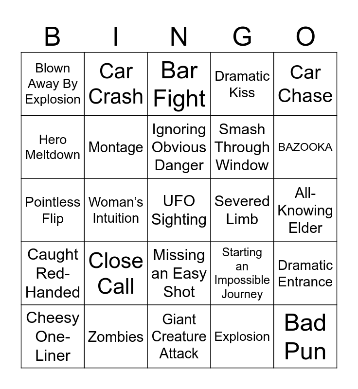 This bingo card has 29 words: Cheesy One-Liner, Hijinks, Woman’s Intuition, Bad Pun, Blown Away By Explosion, Bar Fight, Montage, Close Call, Severed Limb, Zombies, All-Knowing Elder, UFO Sighting, Giant Creature Attack, Explosion, BAZOOKA, Sneaking Around, Missing an Easy Shot, Caught Red-Handed, Car Chase, Pointless Flip, Starting an Impossible Journey, Product Placement, Smash Through Window, Hero Meltdown, Dramatic Kiss, Car Crash, Dramatic Entrance, Ignoring Obvious Danger and Laser.