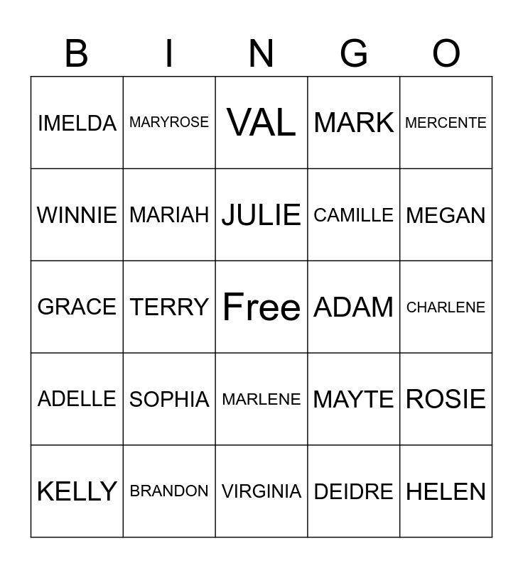 This bingo card has a free space and 24 words: SOPHIA, BRANDON, JULIE, KELLY, MERCENTE, IMELDA, WINNIE, MARYROSE, ADAM, MARLENE, CAMILLE, GRACE, MAYTE, ROSIE, MARIAH, DEIDRE, CHARLENE, VAL, MEGAN, TERRY, HELEN, ADELLE, MARK and VIRGINIA.