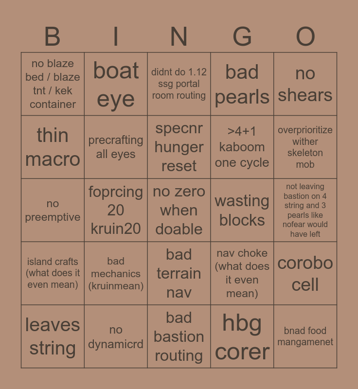 This bingo card has a free space and 24 words: bad mechanics (kruinmean), no dynamicrd, specnr hunger reset, leaves string, no shears, no blaze bed / blaze tnt / kek container, thin macro, boat eye, wasting blocks, bad terrain nav, >4+1 kaboom one cycle, no preemptive, nav choke (what does it even mean), corobo cell, precrafting all eyes, hbg corer, not leaving bastion on 4 string and 3 pearls like nofear would have left, didnt do 1.12 ssg portal room routing, overprioritize wither skeleton mob, foprcing 20 kruin20, bnad food mangamenet, island crafts (what does it even mean), bad pearls and bad bastion routing.