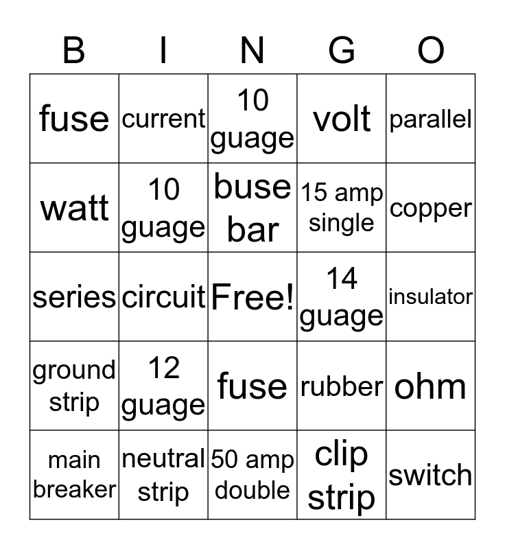 This bingo card has a free space and 24 words: 12 guage, neutral strip, buse bar, main breaker, parallel, fuse, watt, current, 14 guage, fuse, 15 amp single, series, rubber, ohm, 10 guage, clip strip, insulator, 10 guage, copper, circuit, switch, ground strip, volt and 50 amp double.