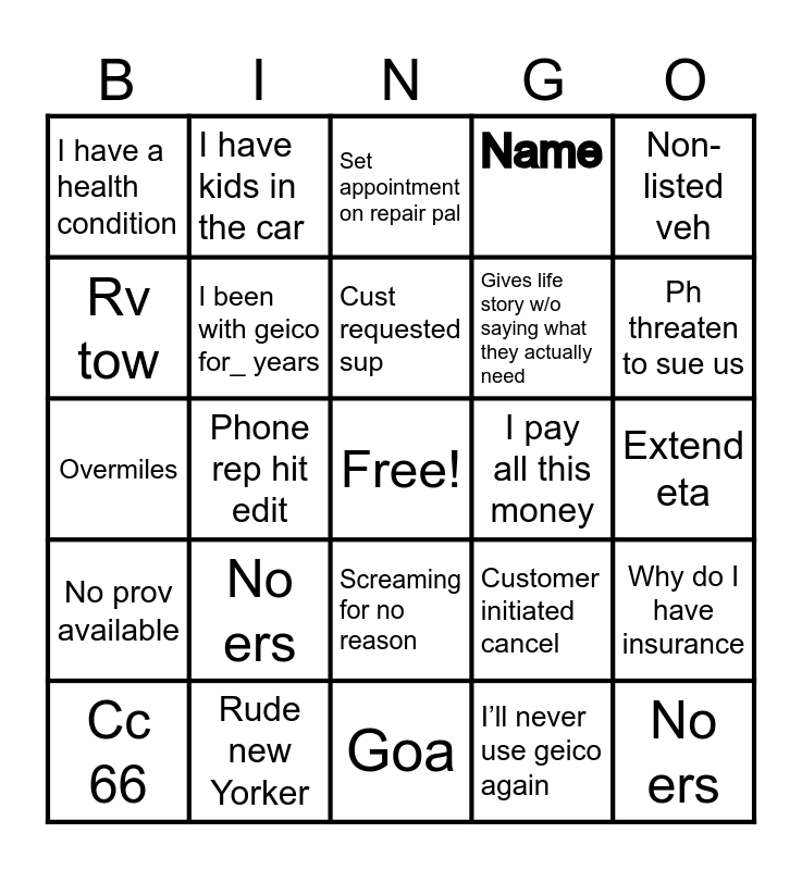 This bingo card has a free space and 24 words: No ers, Rude new Yorker, Cust requested sup, Cc 66, Non-listed veh, I have a health condition, Rv tow, I have kids in the car, I pay all this money, Screaming for no reason, Gives life story w/o saying what they actually need, Overmiles, Customer initiated cancel, Why do I have insurance, I been with geico for_ years, I’ll never use geico again, Extend eta, Set appointment on repair pal, Ph threaten to sue us, Phone rep hit edit, No ers, No prov available, Name and Goa.