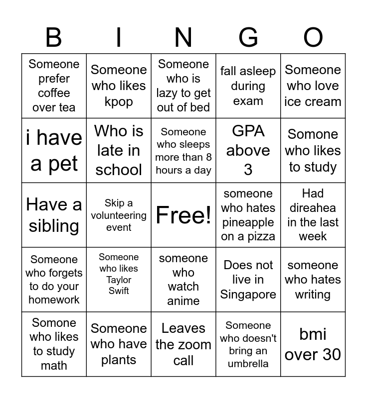 This bingo card has a free space and 24 words: Someone who likes Taylor Swift, Someone who have plants, Someone who sleeps more than 8 hours a day, Somone who likes to study math, Someone who love ice cream, Someone prefer coffee over tea, i have a pet, Someone who likes kpop, someone who hates pineapple on a pizza, someone who watch anime, GPA above 3, Have a sibling, Does not live in Singapore, someone who hates writing, Who is late in school, Someone who doesn't bring an umbrella, Had direahea in the last week, Someone who is lazy to get out of bed, Somone who likes to study, Skip a volunteering event, bmi over 30, Someone who forgets to do your homework, fall asleep during exam and Leaves the zoom call.