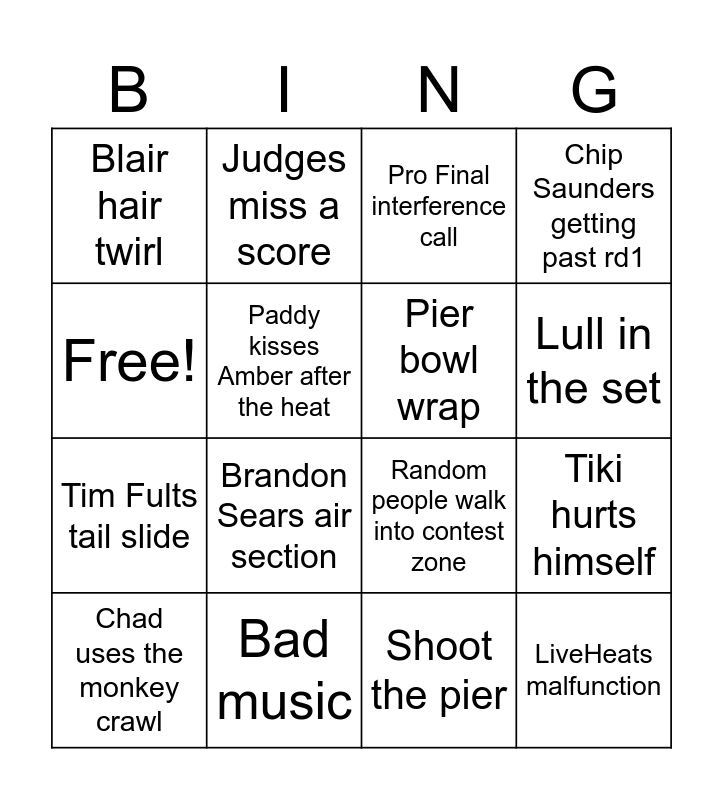 This bingo card has 16 words: Bad music, Tiki hurts himself, Pro Final interference call, Blair hair twirl, Tim Fults tail slide, Judges miss a score, Random people walk into contest zone, Shoot the pier, Free!, Paddy kisses Amber after the heat, Chad uses the monkey crawl, Chip Saunders getting past rd1, Brandon Sears air section, Lull in the set, Pier bowl wrap and LiveHeats malfunction.