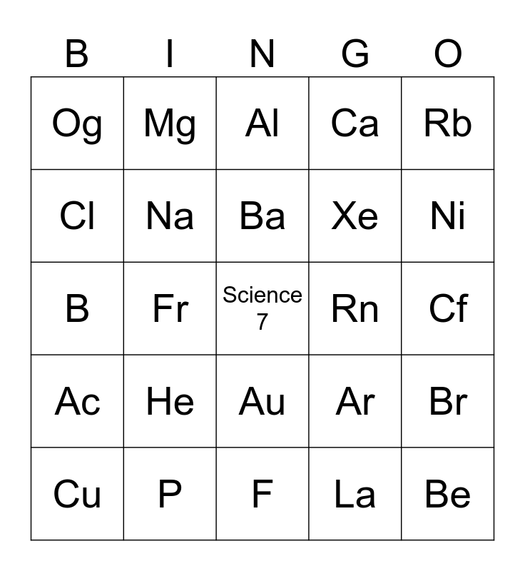 This bingo card has a free space and 49 words: H, Be, Sc, F, He, Li, Mg, Ti, Cl, Ne, Na, Ca, Br, Ar, K, Cs, Ba, Rn, Kr, Rb, Fr, La, Og, Xe, Co, Ni, Cu, Zn, Au, Ac, Th, Pa, U, Np, P, Am, Cm, Bk, Cf, Ez, Fm, Md, No, Lr, B, Al, Ga, In and Nh.