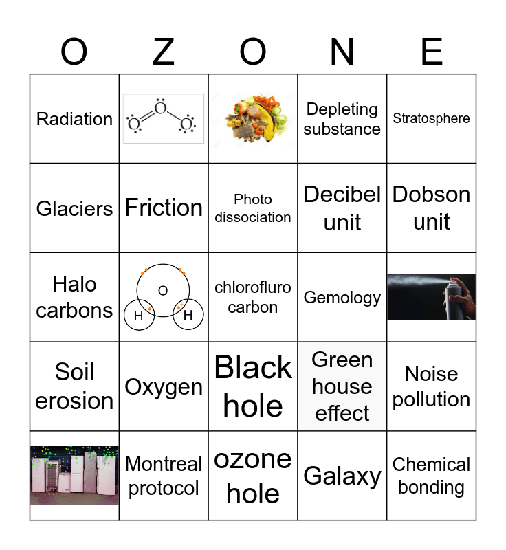 This bingo card has 7 images and 21 words: Montreal protocol, chlorofluro carbon, Galaxy, Stratosphere, Glaciers, ozone hole, Gemology, Chemical bonding, Halo carbons, Friction, Supernova, Green house effect, Dobson unit, Photo dissociation, Depleting substance, Noise pollution, Radiation, Oxygen, Black hole, Decibel unit and Soil erosion.