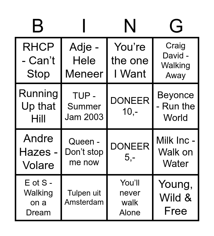 This bingo card has 40 words: Free!, DONEER 5,-, DONEER 25,-, DONEER 10,-, Doneer 50,-, Run DMC - Walk this Way, Beyonce - Run the World, Jay Z - Run this town, Running Up that Hill, Young, Wild & Free, Milk Inc - Walk on Water, Craig David - Walking Away, E ot S - Walking on a Dream, You’ll never walk Alone, Tulpen uit Amsterdam, Summer of 69, Adele - Hello, RHCP - Can’t Stop, Anouk - Nobody’s wife, You’re the one I Want, Liquido - Narcotic, Amy Winehouse - Valerie, Andre Hazes - Volare, TUP - Summer Jam 2003, Bloed, Zweet & Tranen, Crying at the Discotheque, Cher - Believe, Bailando 2023, Faluma, 3 Little Birds, I’d do anything for Love, JVT - Buma in me zak, A-Ha - take on me, CL & MT - Wonderful Days, Queen - Don’t stop me now, Snap - The First, The Last, Daddy T - It’s That time, Eye of the Tiger, Adje - Hele Meneer and Rick Astley.