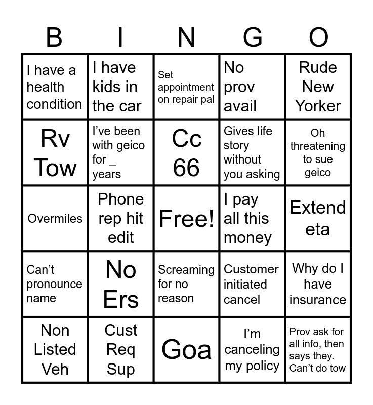 This bingo card has a free space and 24 words: No Ers, Cust Req Sup, Cc 66, Non Listed Veh, Rude New Yorker, I have a health condition, Rv Tow, I have kids in the car, I pay all this money, Screaming for no reason, Gives life story without you asking, Overmiles, Customer initiated cancel, Why do I have insurance, I’ve been with geico for _ years, I’m canceling my policy, Extend eta, Set appointment on repair pal, Oh threatening to sue geico, Phone rep hit edit, Prov ask for all info, then says they. Can’t do tow, Can’t pronounce name, No prov avail and Goa.
