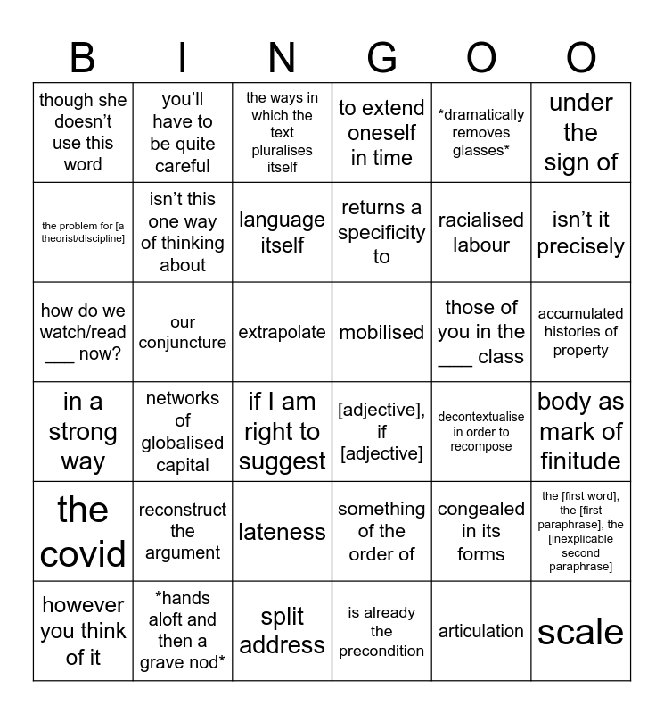 This bingo card has 51 words: diasporic sensibility, how do we watch/read ___ now?, something like, decontextualise in order to recompose, those of you in the ___ class, split address, you’ll have to be quite careful, historical location, under the sign of, is already the precondition, the problem for [a theorist/discipline], to extend oneself in time, networks of globalised capital, in a strong way, obsoleted, congealed in its forms, isn’t this one way of thinking about, our conjuncture, Free!, *dramatically removes glasses*, isn’t it precisely, body as mark of finitude, though she doesn’t use this word, language itself, unevenly distributed ___, the covid, returns a specificity to, someone paraphrase this for me, if I am right to suggest, the ways in which the text pluralises itself, rehearses the periodisation, the [first word], the [first paraphrase], the [inexplicable second paraphrase], if we follow ___’s direction, you don’t have to agree with me, *hands aloft and then a grave nod*, [adjective], if [adjective], lateness, articulation, scale, urgencies, extrapolate, mobilised, let us say, as it were, reconstruct the argument, something of the order of, racialised labour, however you think of it, inscribed into the narrative, accumulated histories of property and inscribed on the page.